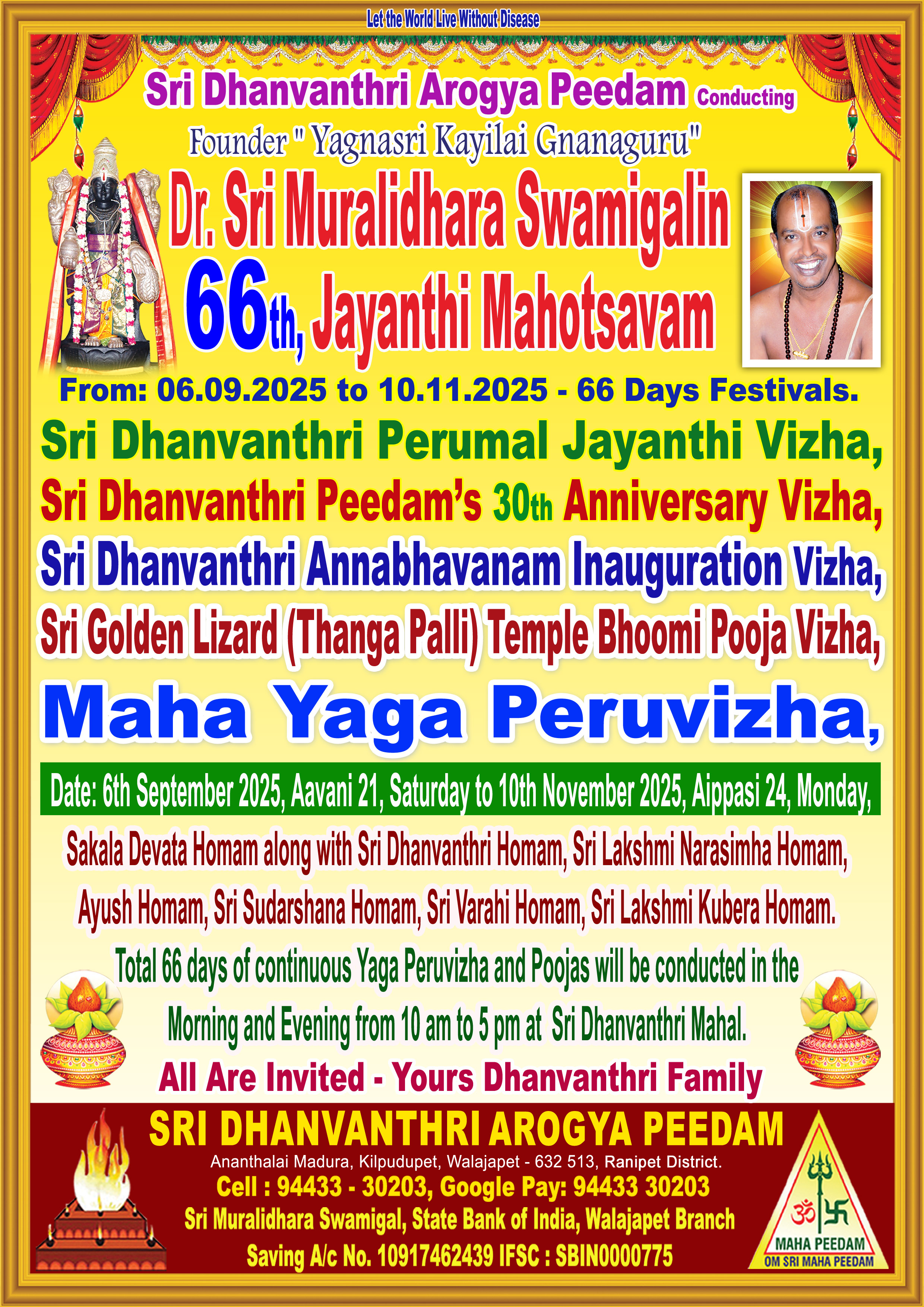 Sri Danvantri Arogya Peedam, Anandhalai Madhura, Kilpudupet, Walajapet 632 513, Ranipet Dist. Tamil Nadu, India, Email: danvantripeedam@gmail.com, Ph: 94433 30203.